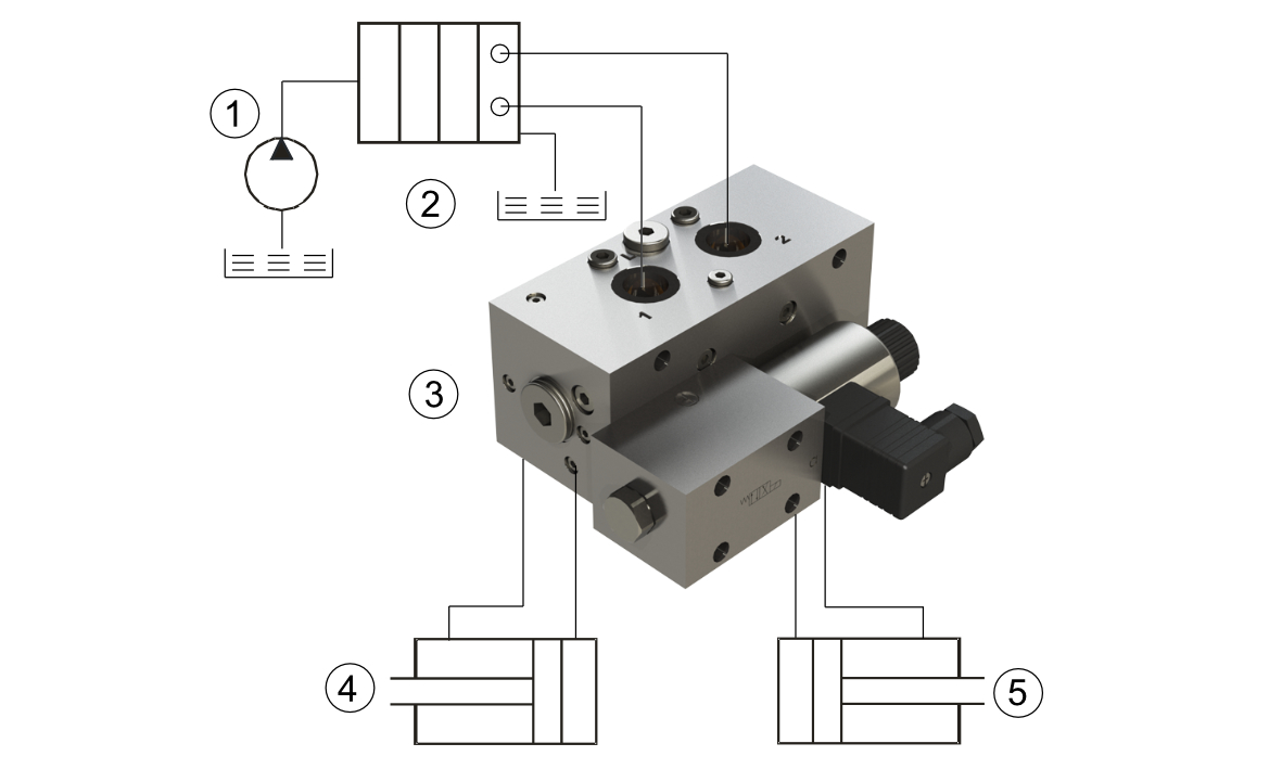 auf wahlweise 2 doppeltwirkende Verbaucher verteilen.Im geschalteten Zustand